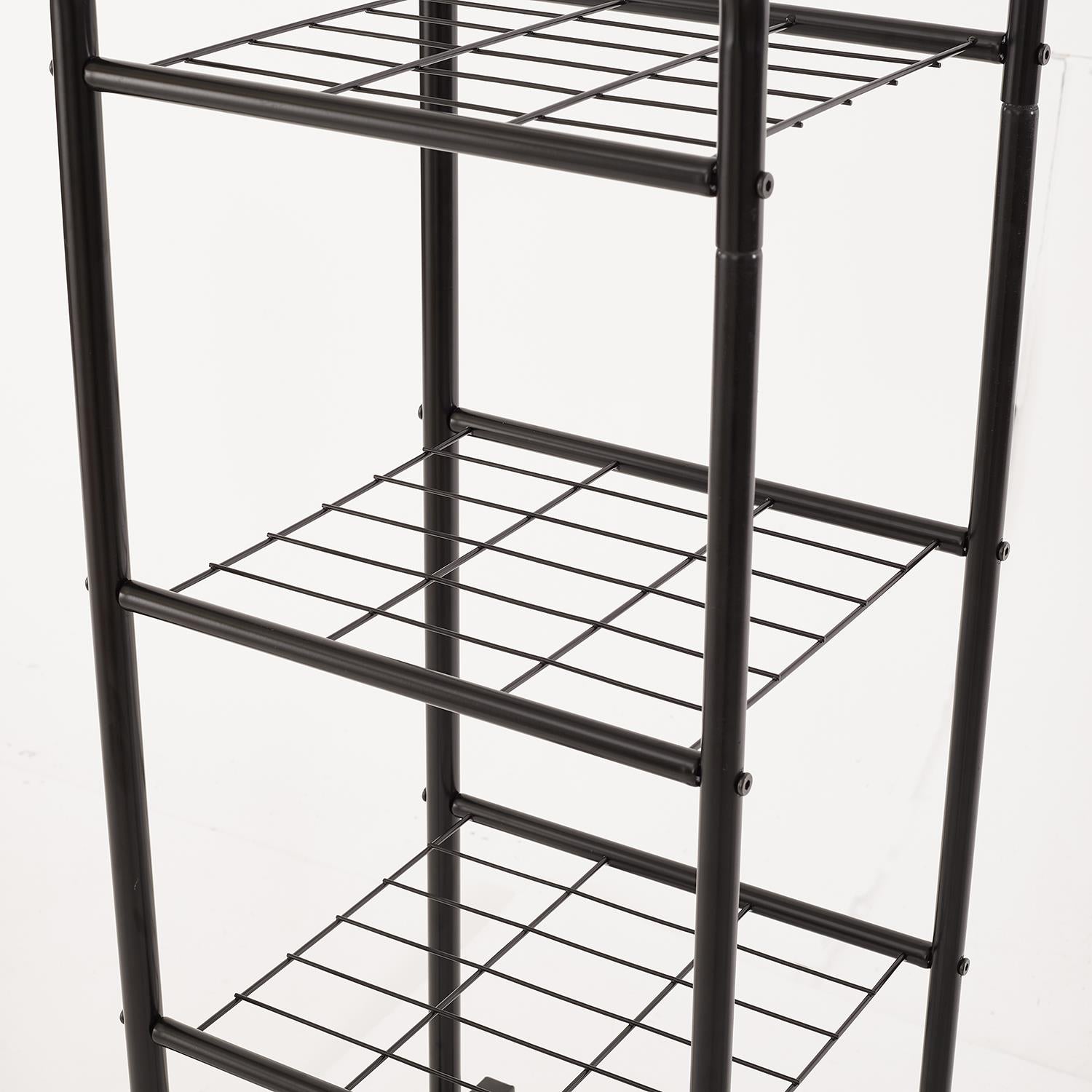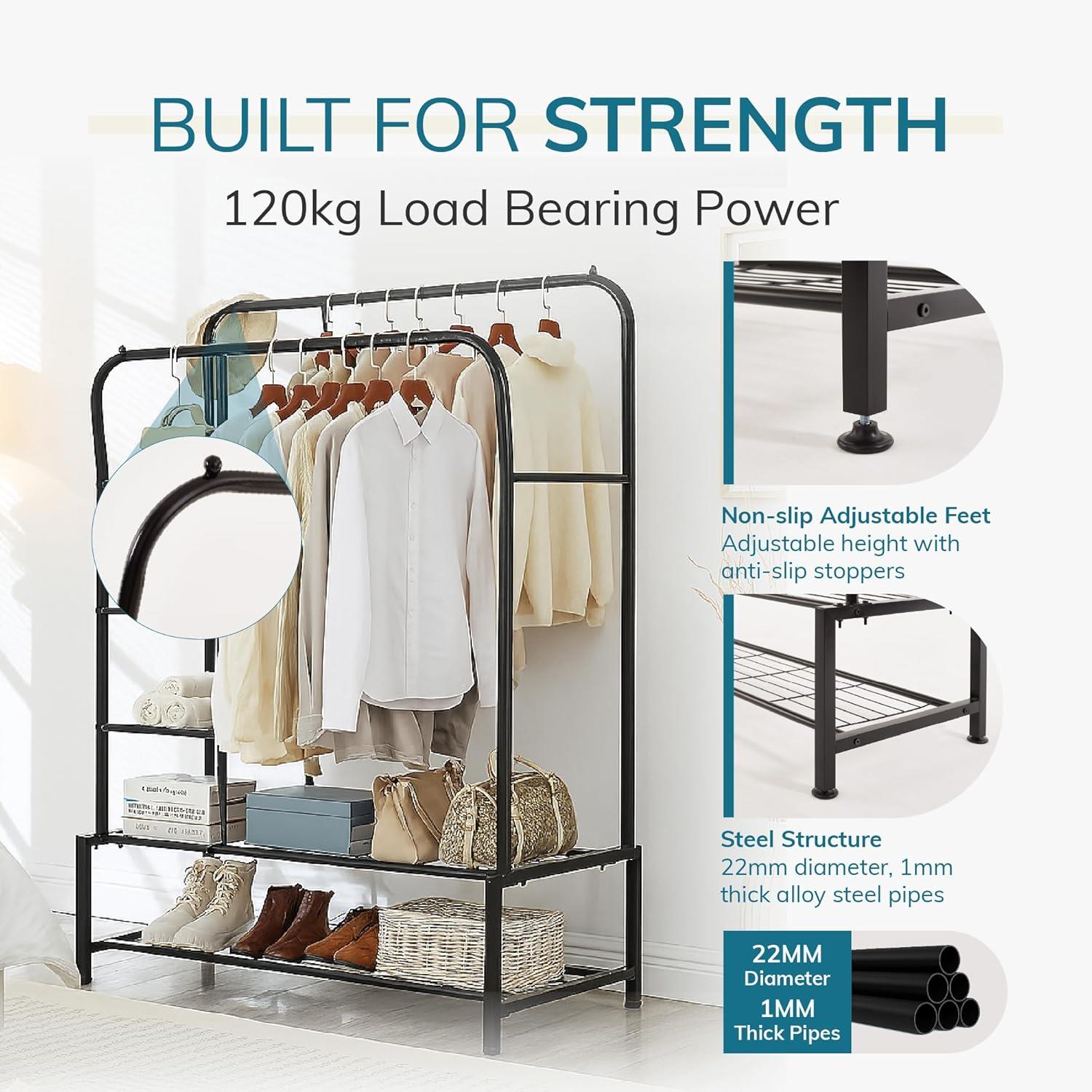 This clothes rail combines generous hanging space with practical shelving to provide a complete storage solution for clothing and accessories. It features double hanging rails at 140cm and 160cm, offering options for shirts, dresses, and longer garments, alongside four side shelves and two shoe racks for shoes, bags, and folded clothes. Built from a strong black steel frame with a 120kg load capacity, it ensures durability and reliability while keeping everything neatly organised. Measuring 115cm wide, 40cm deep, and 140/160cm high, this versatile organiser is ideal for bedrooms, laundry rooms, offices, or retail displays.