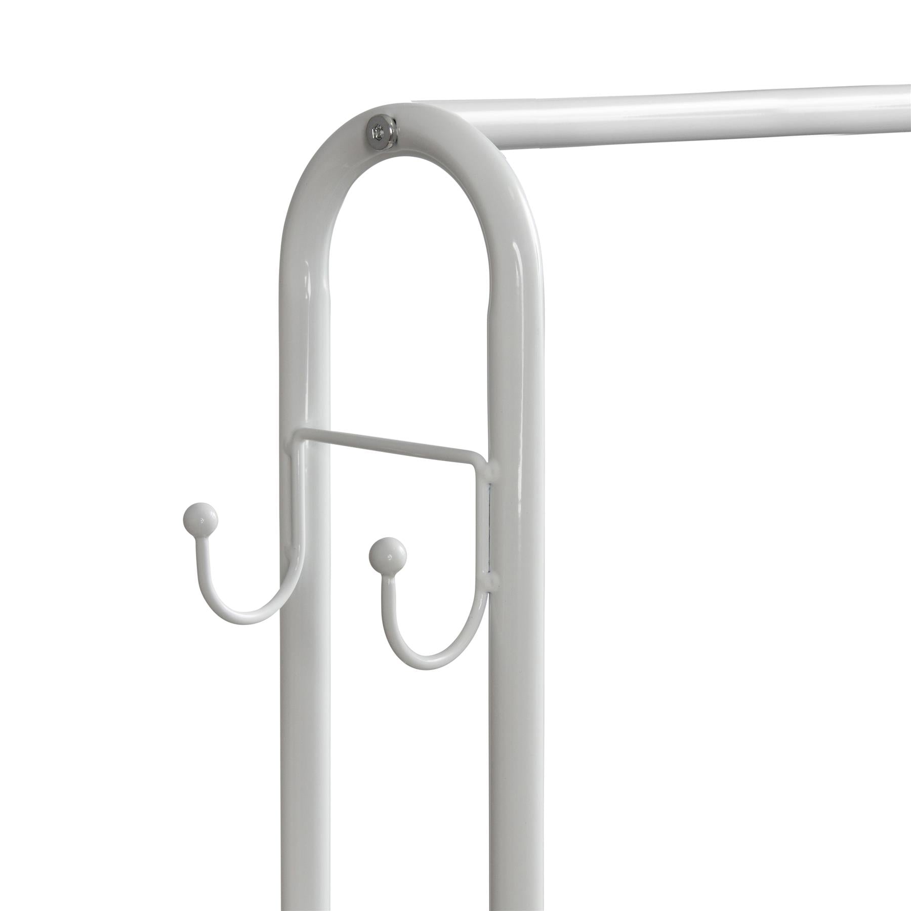 A great alternative to a wardrobe for space saving storage, the white clothes rail with two shelves is perfect for hanging clothes on display. It is the perfect storage solution not only for your bedroom but for hallways, offices and porches. The sturdy steel design finished in white powder coating can compliment all types of décor and adds a beautiful elegant style to the room. The clothes storage rail features 2 handy hooks on either side which are perfect for hanging bags, umbrellas, scarves and other accessories. The 2 lower shelves provide extra storage and organisation for shoes, boxes and baskets. Size: 150cm height x 68cm width x 34cm depth