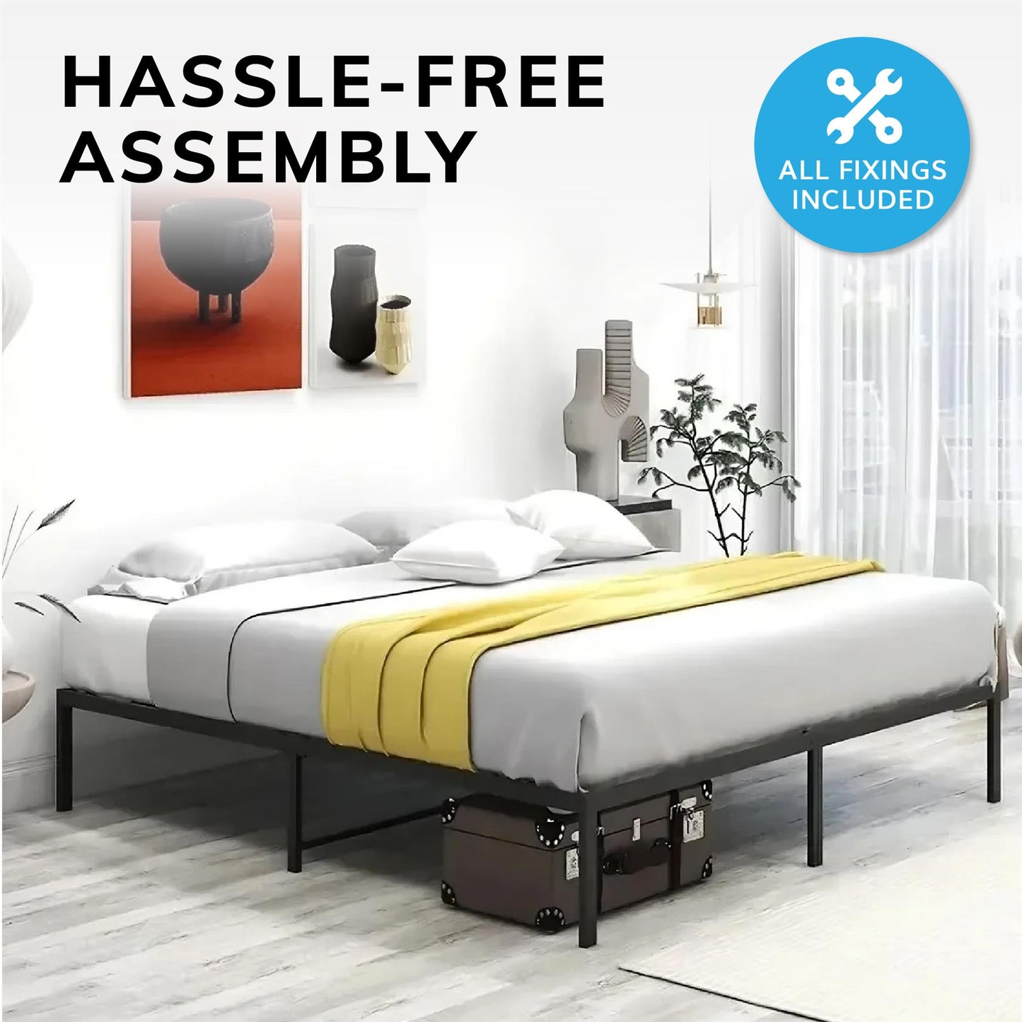 This durable Double bed frame is designed with a sleek black powder coating, making it a stylish and sturdy addition to any bedroom. The simple yet functional design serves its primary purpose as a bed frame, providing strong support for your mattress. Easy-to-assemble frame with clear instructions provided. This bed frame blends strength, functionality, and modern style to deliver a practical and elegant sleeping solution. -Heavy-Duty Steel Frame: Made from strong steel metal tubes, ensuring long-lasting durability and stability. -Black Finish: Provides a sleek, modern look while also protecting the frame from rust and general wear. -Spacious Double Size: With dimensions of 138x191x35 cm, this frame is ideal for double mattresses, offering ample sleeping space. -Simple, Minimalist Design: The minimalist design blends well with various décor styles without overwhelming the room. -Easy Assembly: Designed for straightforward assembly, this bed frame comes with easy-to-follow instructions, allowing for quick setup.