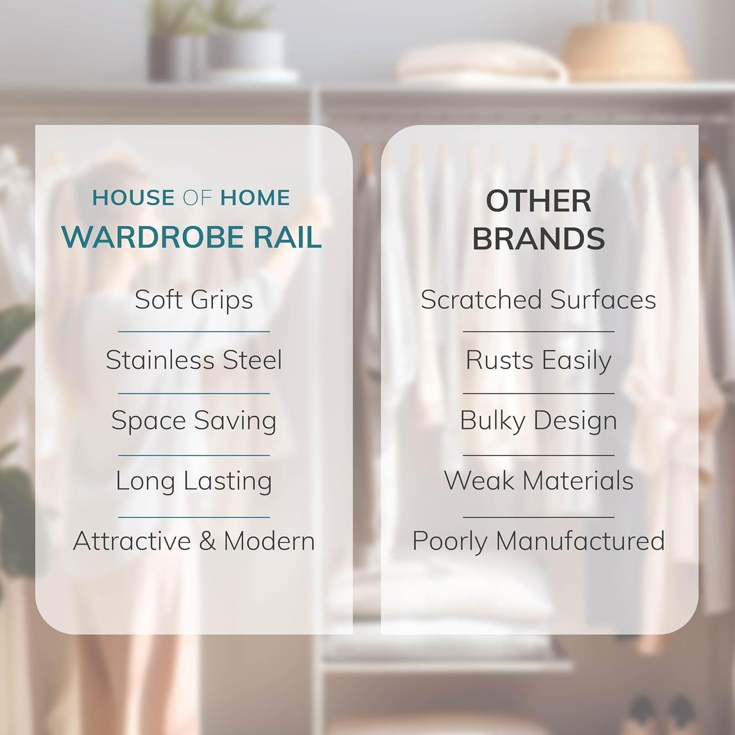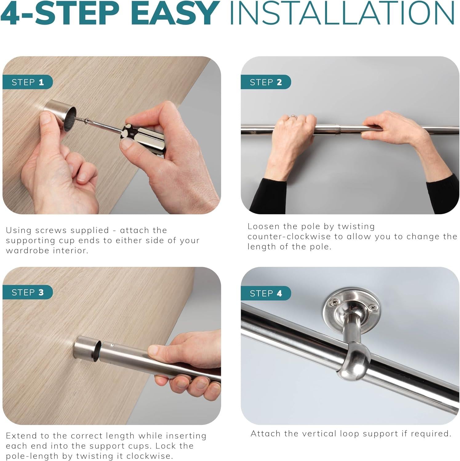 Rust Resistant Beauty: Manufactured with high-grade stainless steel, our extendable wardrobe rails resist rust, maintaining a smooth and shiny appearance over time.