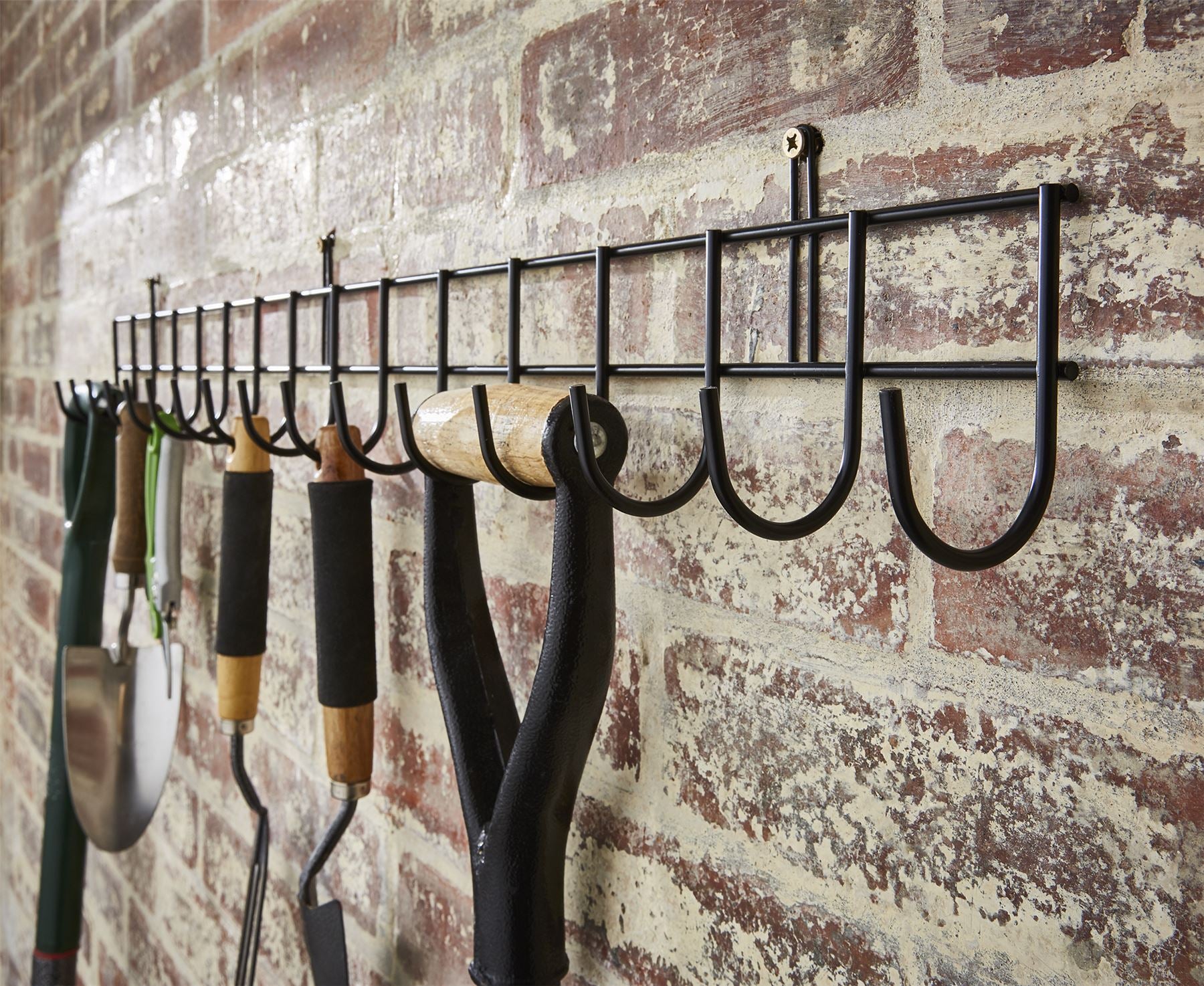 This extra-long tool rack has 16 hooks and is perfect for garden sheds or garages to keep your tools organised and to hand. It is very simple to install with the 2 supplied screws. Made from steel with a black powder coated finish Size - 102cm length x 12cm height x 6cm depth (TOOLS NOT INCLUDED)