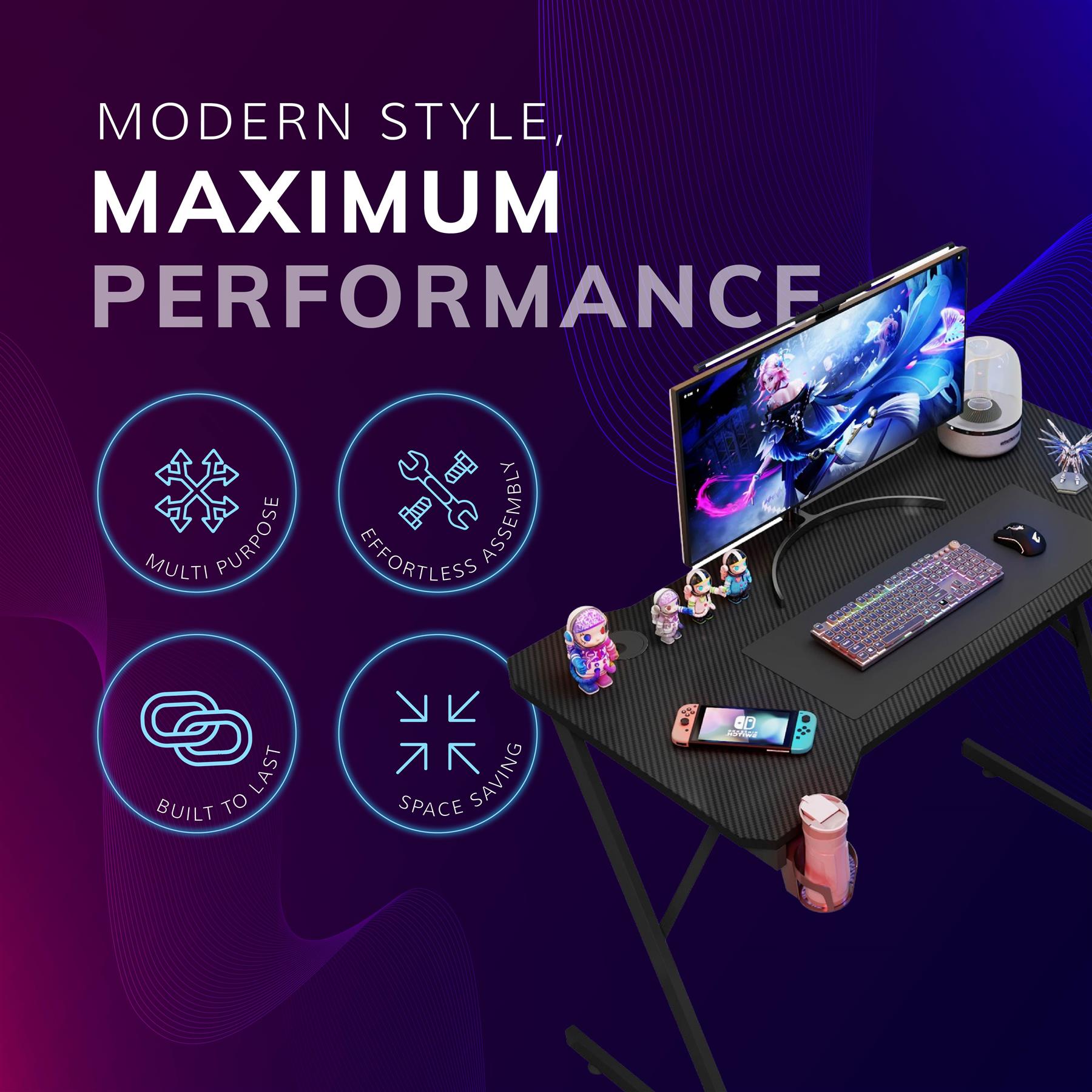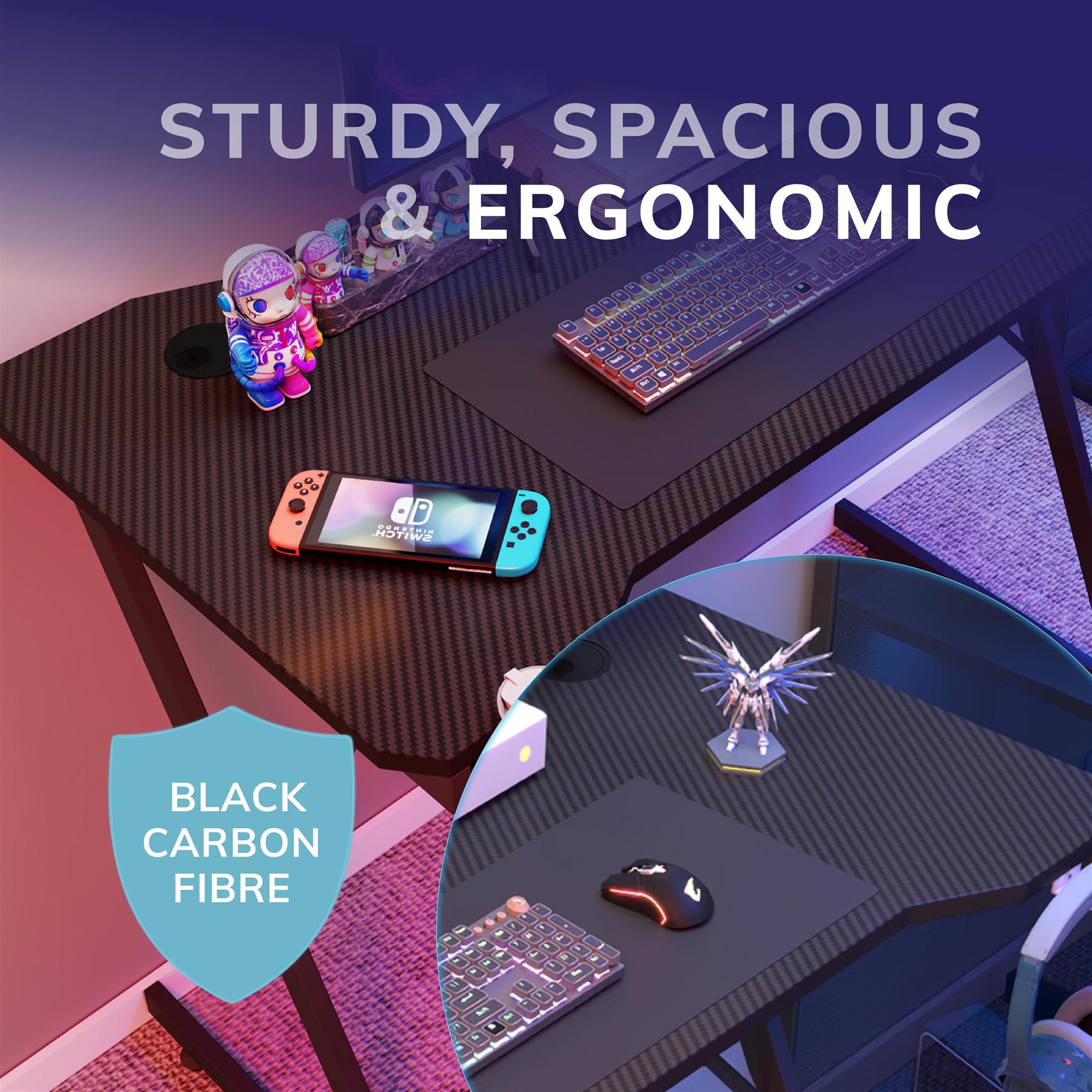 A streamlined, no-fuss desk built for performance. With a clean, flat 120cm surface, this carbon fibre-style workstation suits both gaming setups and home offices. Simple, sturdy, and fitted with smart features to help you stay organised.