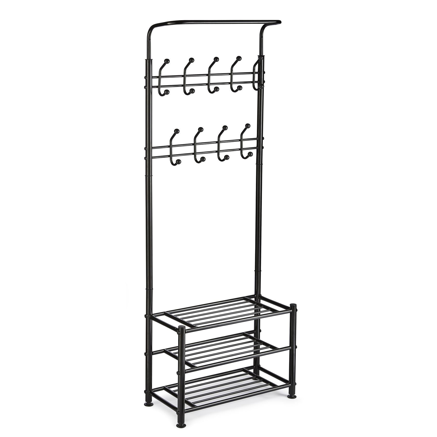 This multifunctional coat hooks and stand with shoe storage is the perfect solution for a cluttered hallway. It has been designed to hold up to 18 garments including coats, jackets, scarves and more. It has been manufactured using strong steel and finished in a black powder coating. Size - 188cm height x 68cm width x 31cm depth Weight capacity: up to 80kg