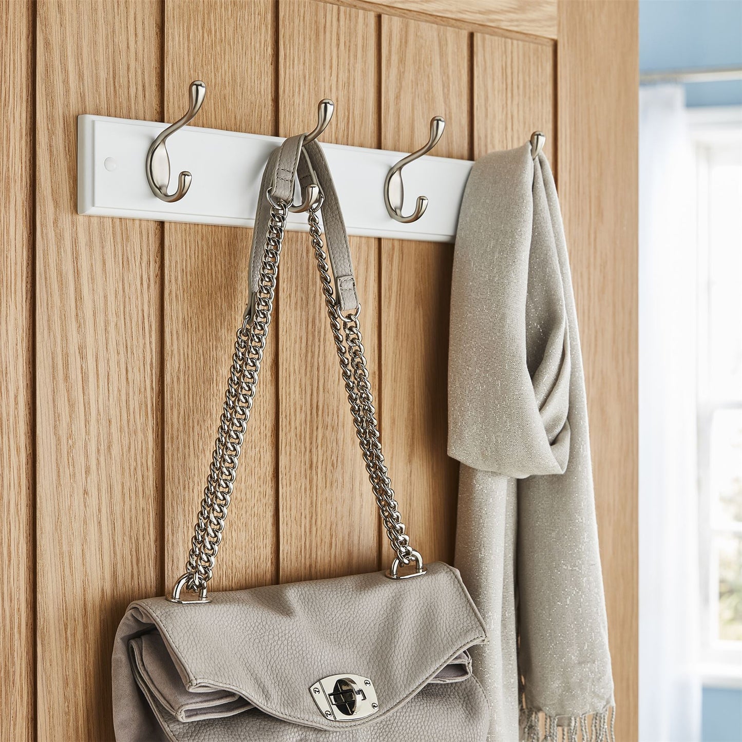 White wall mountable coat hanger with 8 nickel hooks for hanging a variety of garments. White board is made of wood. Comes complete and ready to use with wall fixings included. Can be mounted on to doors or walls. 1.5 x 45 x 7 cm