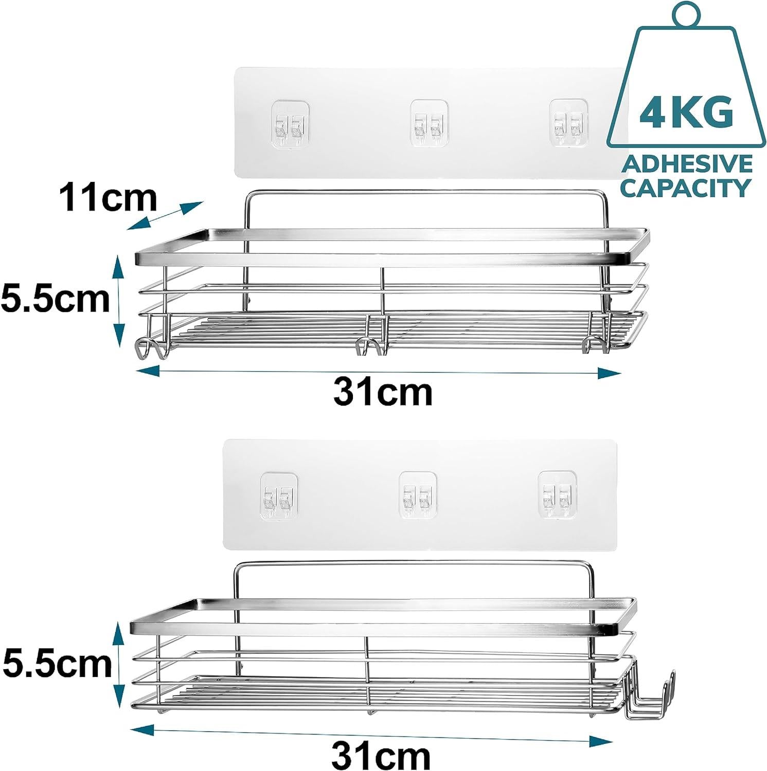 The set of 2 stainless steel shower caddy are extremely easy to set up. They attach to the tiles/ wall with an adhesive application and then the shelf is simply clipped into place. Suitable for smooths surfaces such as tiles, marble, glass metal and wood. These shelves have been designed to store all of your body washes and shampoos etc… They are very versatile and can also be just as at home attached to your kitchen cupboard. EASY TO CLEAN - Simply use a damp cloth to wipe clean, then dry your shower caddy with soft cotton cloth. Dimensions: Self adhesive back plate: W 27cm x H 7cm Shelves: W 31cm x H 8cm x D11cm (Inner shelf height 5.5cm)