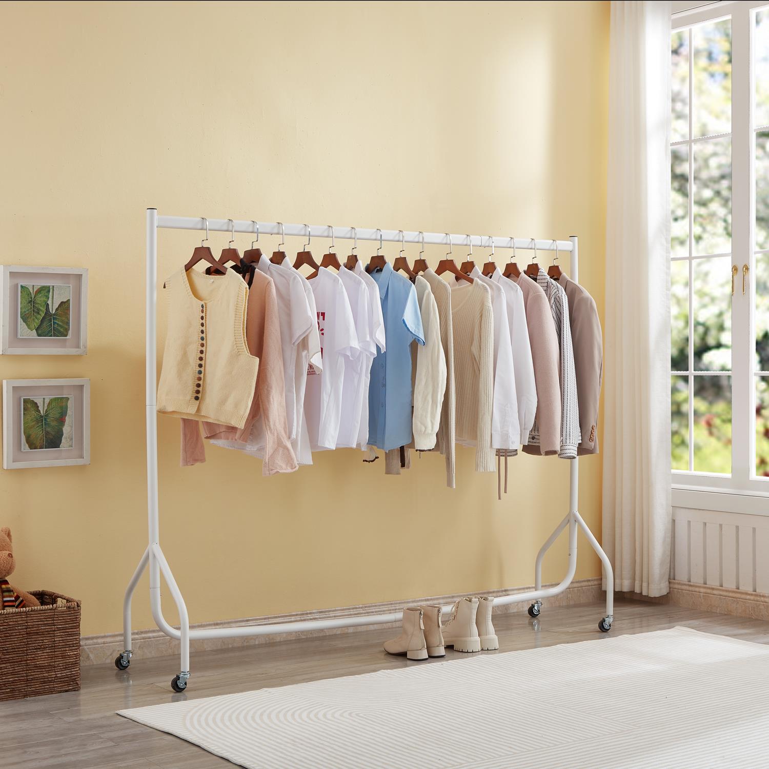 Superior quality heavy duty 5ft long x 5ft tall clothes rail. Very easy to erect, light weight but yet very sturdy due to the heavy gauge steel material. The frame has a pop clip system that allows you to take down a collapse as easy as it is to erect. Great for storing your garments on and will give you the extra hanging space that you need. Also look at our clothes rail covers for protecting your clothes from dirt and dust.