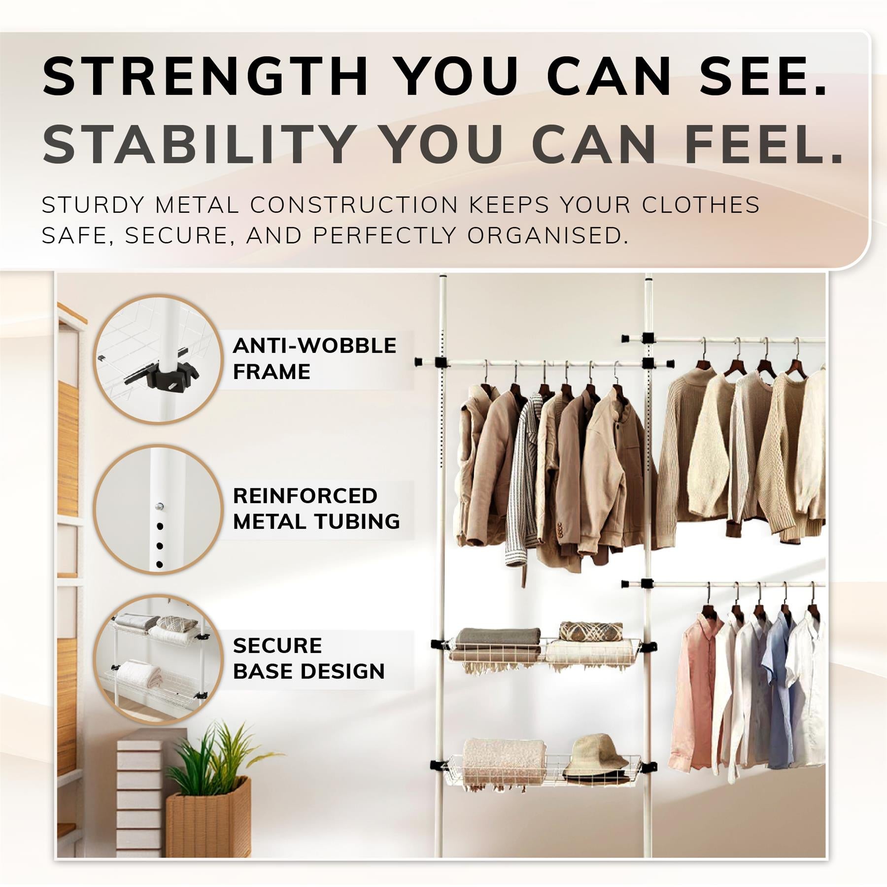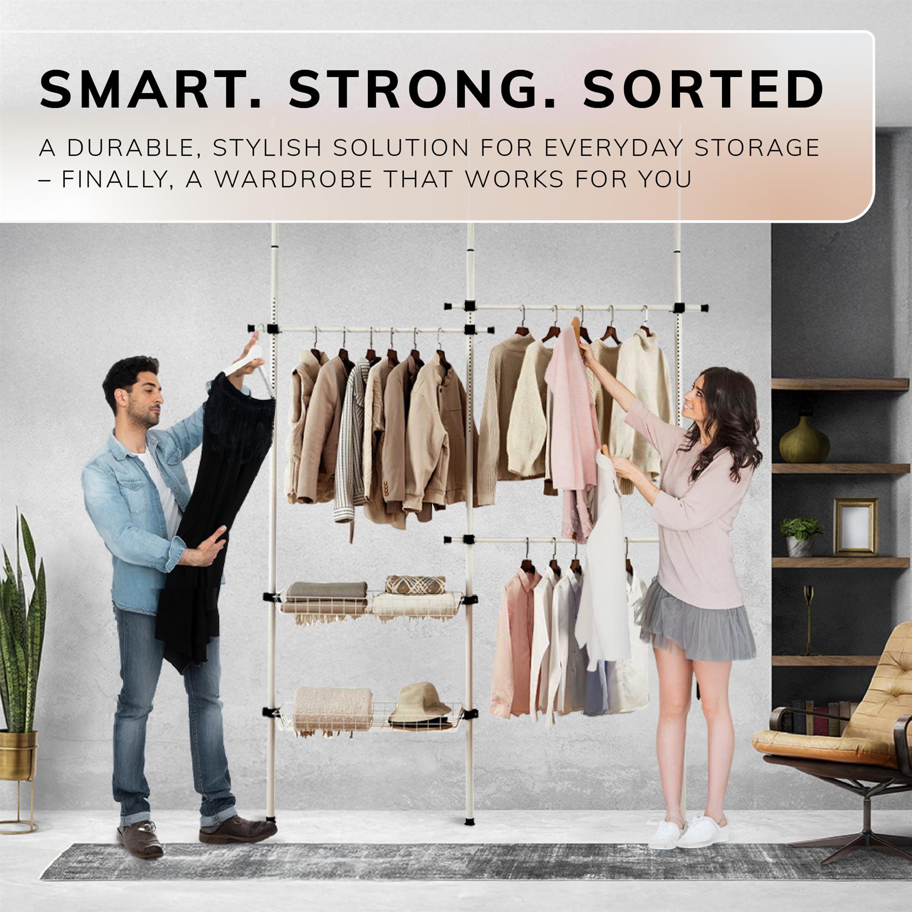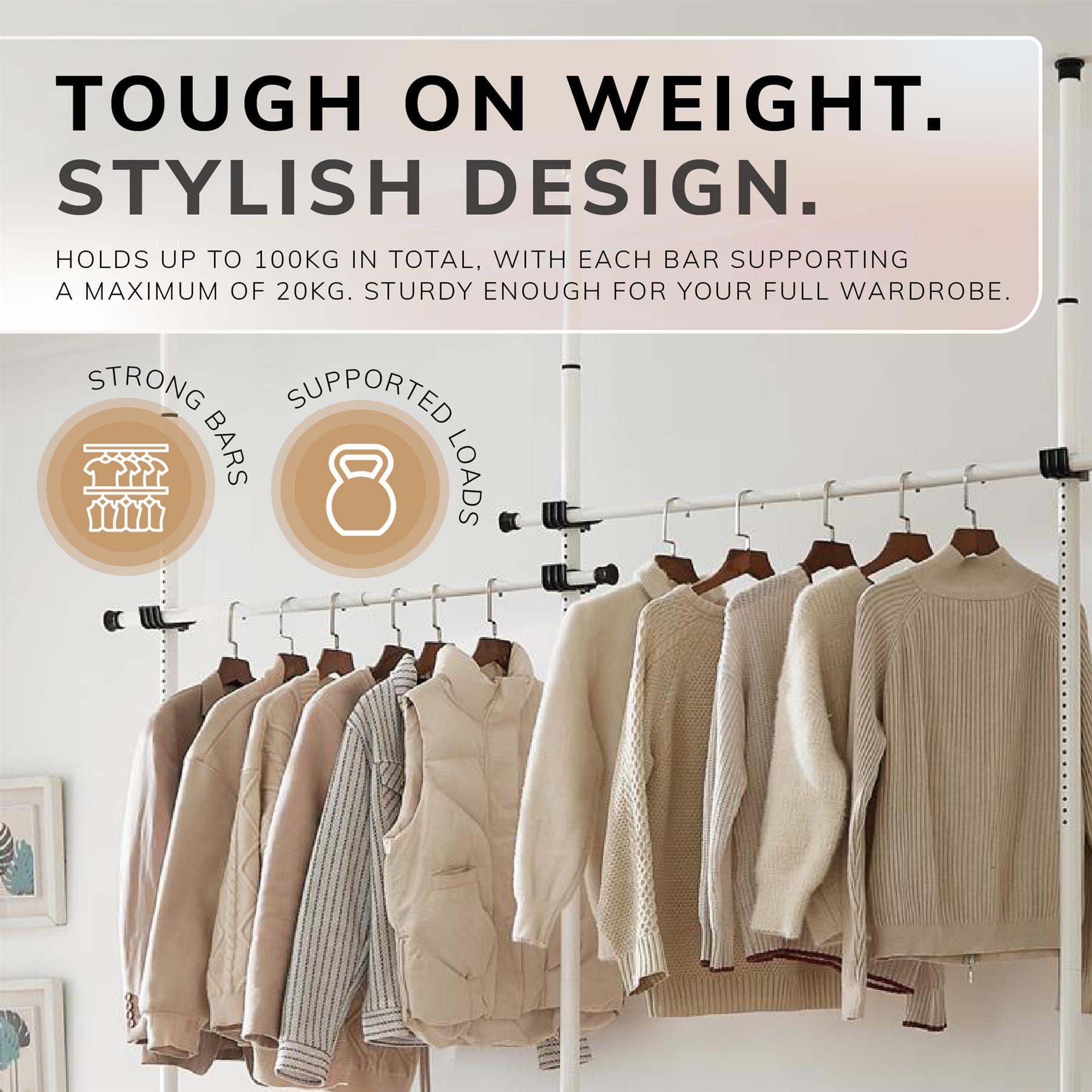 Transform your space seamlessly with our reliable and adjustable tension-based Clothes Rail.
