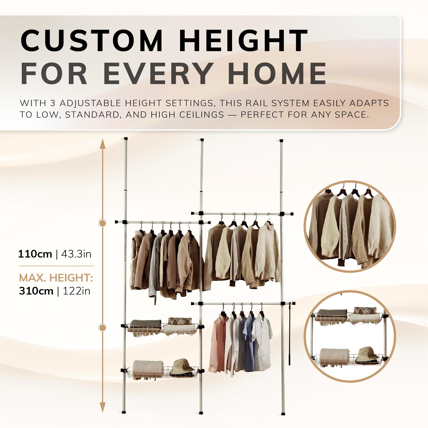 Elevate your storage solutions with our innovative tension-based Clothes Rail. Featuring robust internal springs, this system effortlessly creates tension between your ceiling and floor, eliminating the need for tools or screws during installation. Rest easy knowing it won't leave any unsightly scratches on your walls, ceiling, or floors.