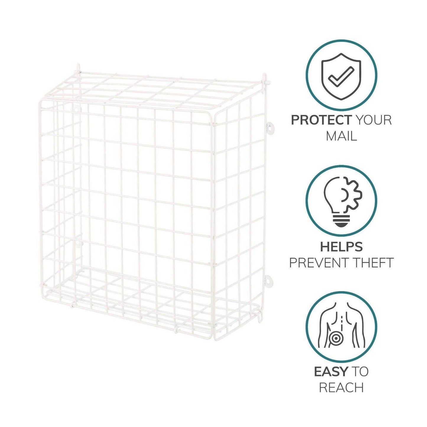 With lift up lid the mail catcher is easy to access and also can be locked with the added use of a padlock. The letter box cage helps to protect your post from your pets. Made of thick strong metal wire. Coated in white powder coated paint. Size - 33.5cm H x 32cm W x 13cm D Comes flat packed - Very simple to put together. Fixings included This letter box catcher can be mounted on wooden doors with the use of the screws (included).